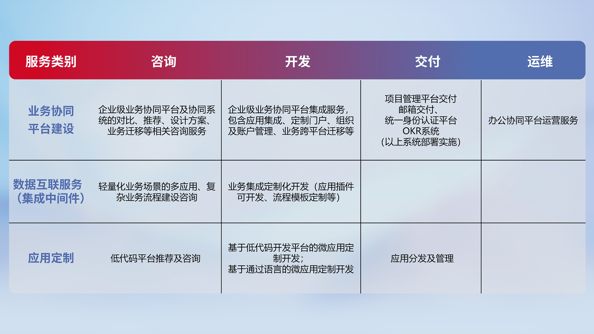 针对钉钉、、企微、、、、IDaas等平台级产品提供产品的规划、、、方案、、交付、、、定制化开发等服务,,,实现如统一协同办公、、智能客户服务、、混合会议管理、、、、智能数据查询、、、等业务场景,,实现数字化转型。。